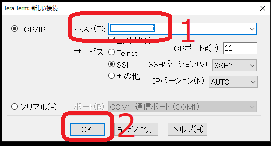 (2)赤枠1にVPSのIPアドレスを入力し、赤枠2の「OK」をクリック