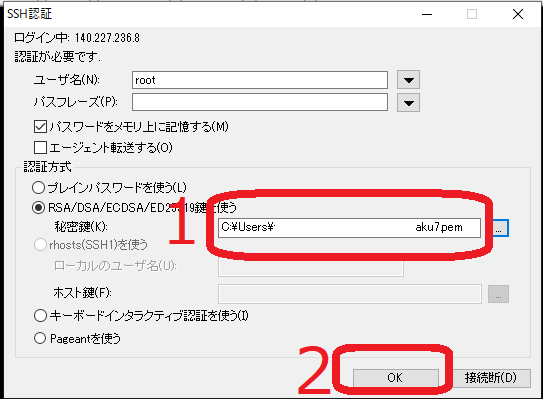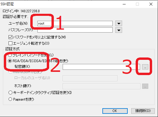 (4)赤枠1に「root」と入力し、赤枠2の「RSA…」にチェックを入れ、赤枠3をクリックして秘密鍵の場所を指定