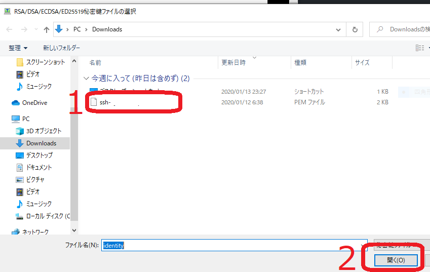 (5)秘密鍵はダウンロードフォルダに保存されているので、ダウンロードフォルダを開いて赤枠1の秘密鍵をクリックし、赤枠2の「開く」をクリック