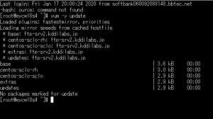 (2)上図赤枠のカーソル部分に「yum -y update」と入力すると、ソフトのアップデートが始まる。「yum」(ヤム)は、ソフトのインストールやアップデートのコマンド(命令文)、「-y」は命令実行中にYes/Noの判断を求められたらすべて「Yes」と回答するとの意味、「update」はアップデートしろという命令文。「yum -y update」と入力し終えたら、キーボードの「Enter」キーを押下(以降、命令文を入力して実行するには「Enter」キーを押下のこと)。アップデートされたファイルの一覧が表示される。「No packages marked for update」はアップデートするファイルが無いとのメッセージ