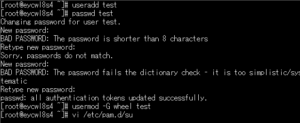 画面ニ行目の「passwd test」は、testのパスワードを設定するコマンド。