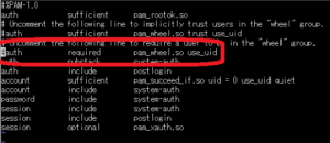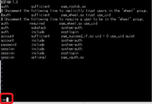二行目の「 vi /etc/pam.d/su」は、「/etc/pam.d/」フォルダ内にあるファイル「su」をテキストとして編集する「vi」というコマンド。