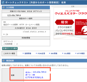 赤枠の「ホスト=VPSのIPアドレス ポート=80 にアクセスできました。」と表示されることを確認