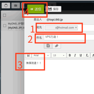 (3)赤枠1にあて先のメールアドレスを入力(例示はhotmail宛)し、赤枠2にタイトル、赤枠3に本文を入力して、赤枠4の「送信」をクリック。