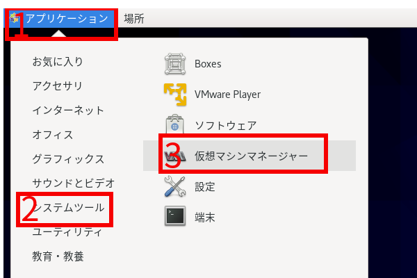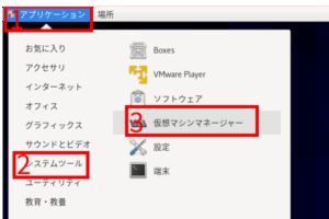 A.赤枠1の「アプリケーション」をクリックして、表示される一覧から赤枠2の「システムツール」をクリックし、さらに表示される一覧から赤枠3の「仮想マシンマネージャー」をクリック