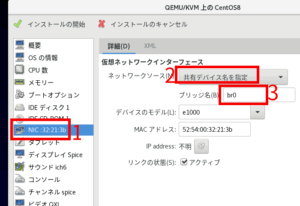 M.カスタマイズ画面が表示されるので、赤枠1の「NIC:…」をクリックし、赤枠2の一覧から「共有デバイス名を指定」を選択し、赤枠3にブリッジ名(例示では「br0」)を入力してから、画面左上の「インストールの開始」をクリック