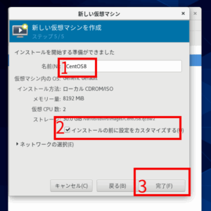 L.赤枠1の名前を「CentOS 8」に変更し、赤枠2の「…カスタマイズする」にチェックを入れ、赤枠3の「完了」をクリック