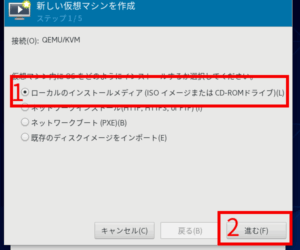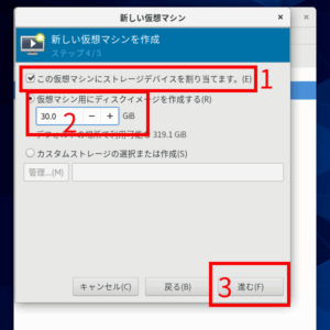 J.赤枠1にチェックを入力して、赤枠2にディスク容量を入力し、赤枠3の「進む」をクリック