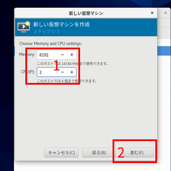 I.赤枠1に割り当てるメモリーとCPUの量を入力。OSによって必要なメモリー量が異なるので確認のこと。私はPCスペックの半分を割り当てた