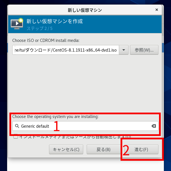 H.赤枠1に「g」を入力して、表示されるされる一覧の最後にある「Generic default」をクリックし、赤枠2の「進む」をクリック