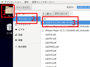 G.表示される下図の赤枠2の「ダウンロード」をクリックして、表示される一覧から赤枠3の「CentOS 8…」をクリック