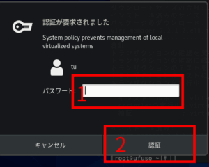 B.この画面が表示される場合には、赤枠1にユーザーパスワードを入力して、赤枠2の「認証」をクリック