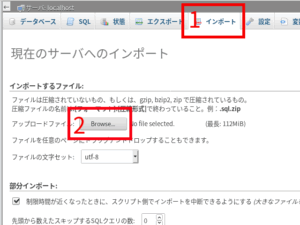 #赤枠1の「インポート」をクリックして、表示される画面から赤枠2の「Browss…」をクリック。