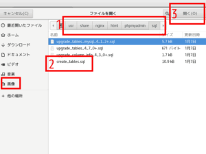 #赤枠1のとおりに順次フォルダをクリックしていき、赤枠2の「create_tables.sql」ファイルをクリックして赤枠3の「開く」をクリック。