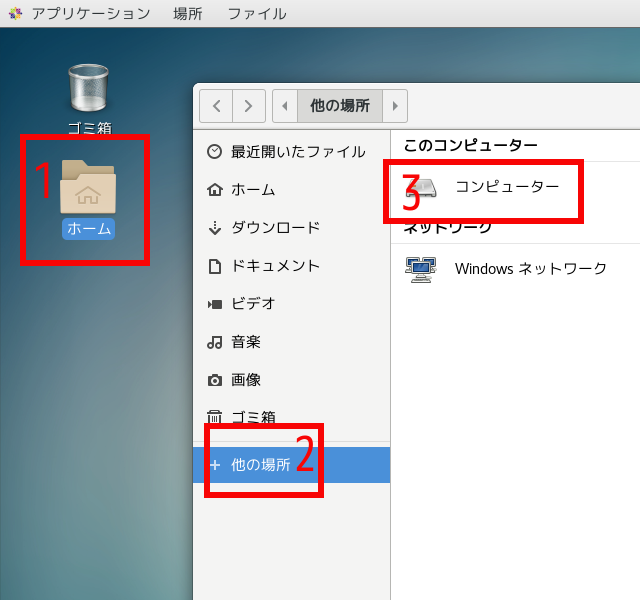 #赤枠1の「ホーム」フォルダをクリックして、表示される一覧から赤枠2の「他の場所」をクリック。以下、赤枠3の「コンピューター」フォルダをクリック。